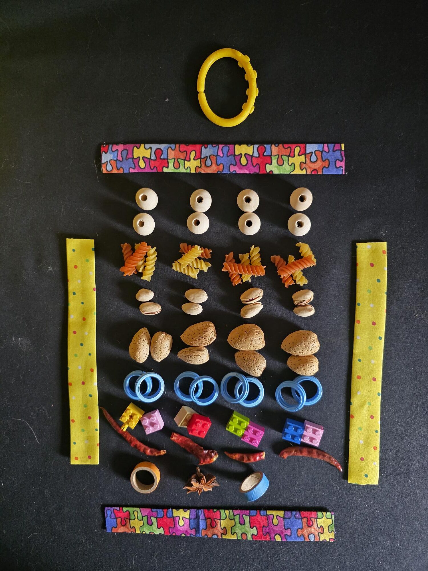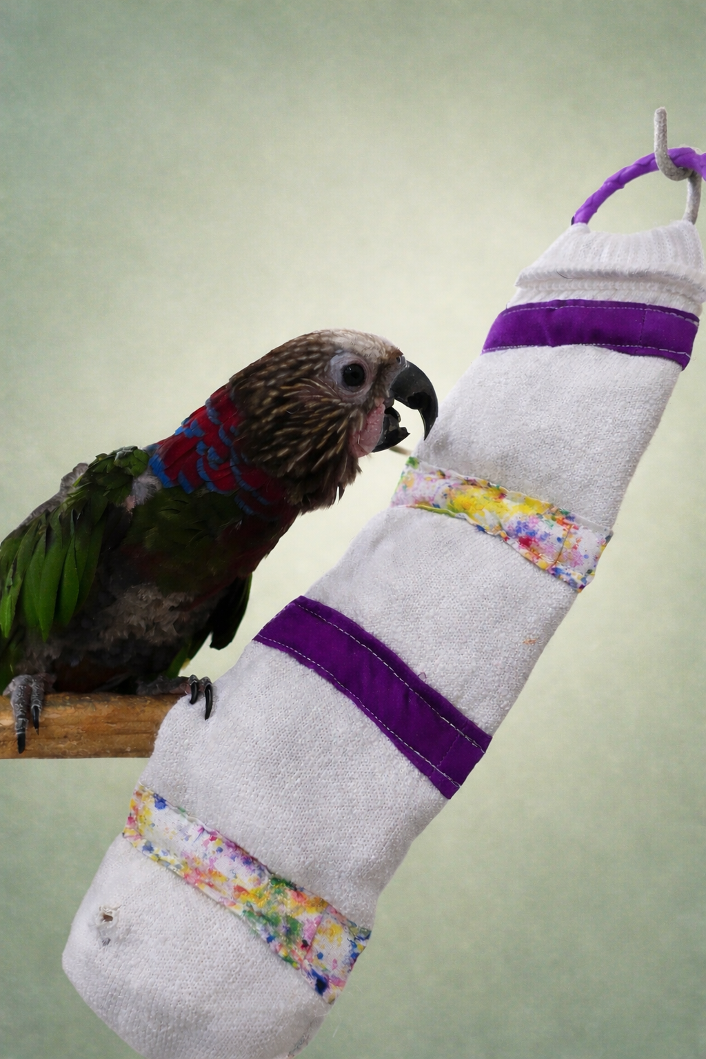 Our original and most popular size. Classics measure about 15 inches long by 4 inches wide, with four compartments stuffed full with dried pasta, dried chilies, star anise, cardboard birdie bagels, plastic rings, Legos, wooden beads and almonds and pistachios in the shell, and other bird-safe enrichment items. Topping it off are colorful plastic buttons hand-sewn to the outside. The Classic includes a colorful plastic ring for hanging on cages, play stands or travel cages.
